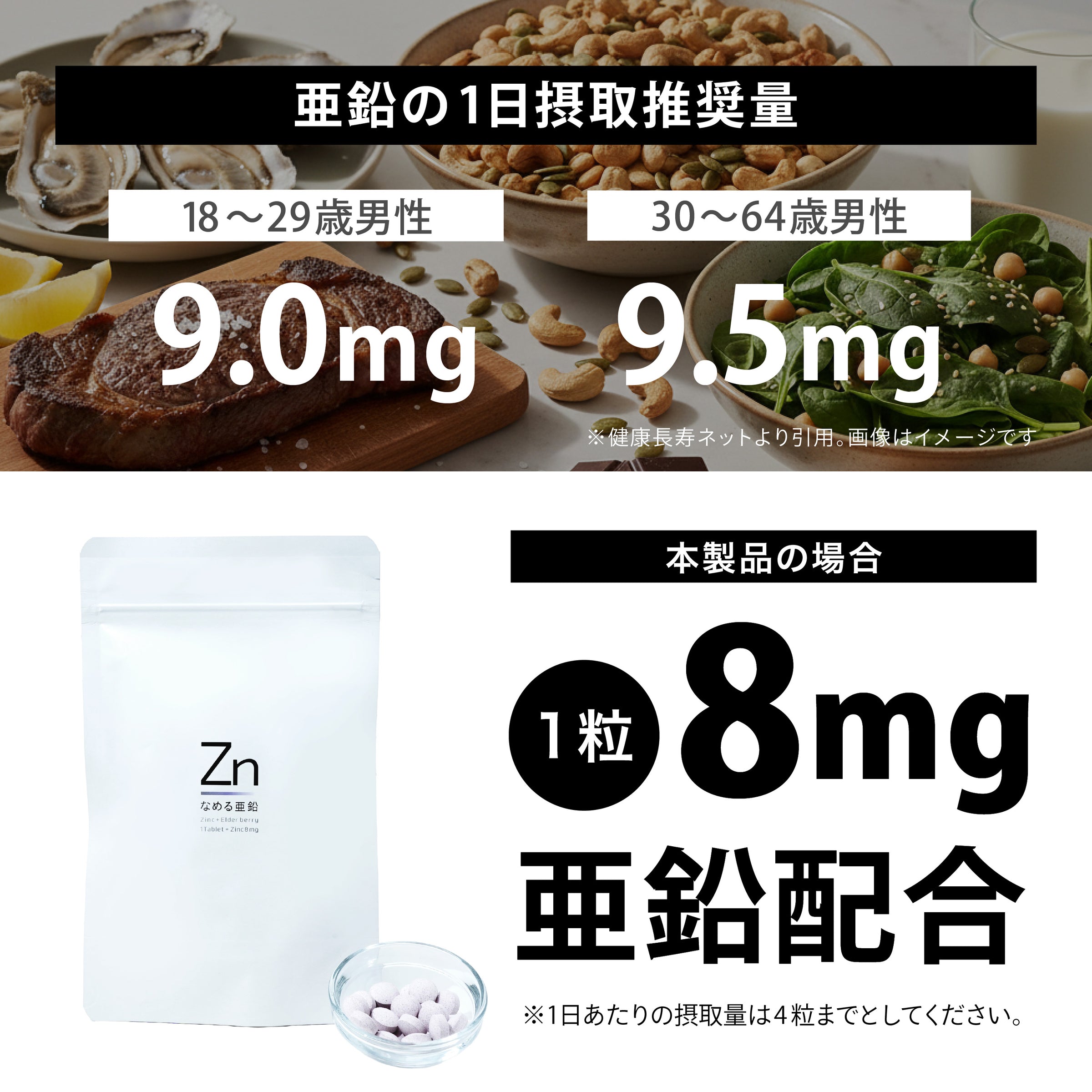 (亜鉛の上限値は、年齢・性別によって異なります。詳しくはコチラをご参照ください。)