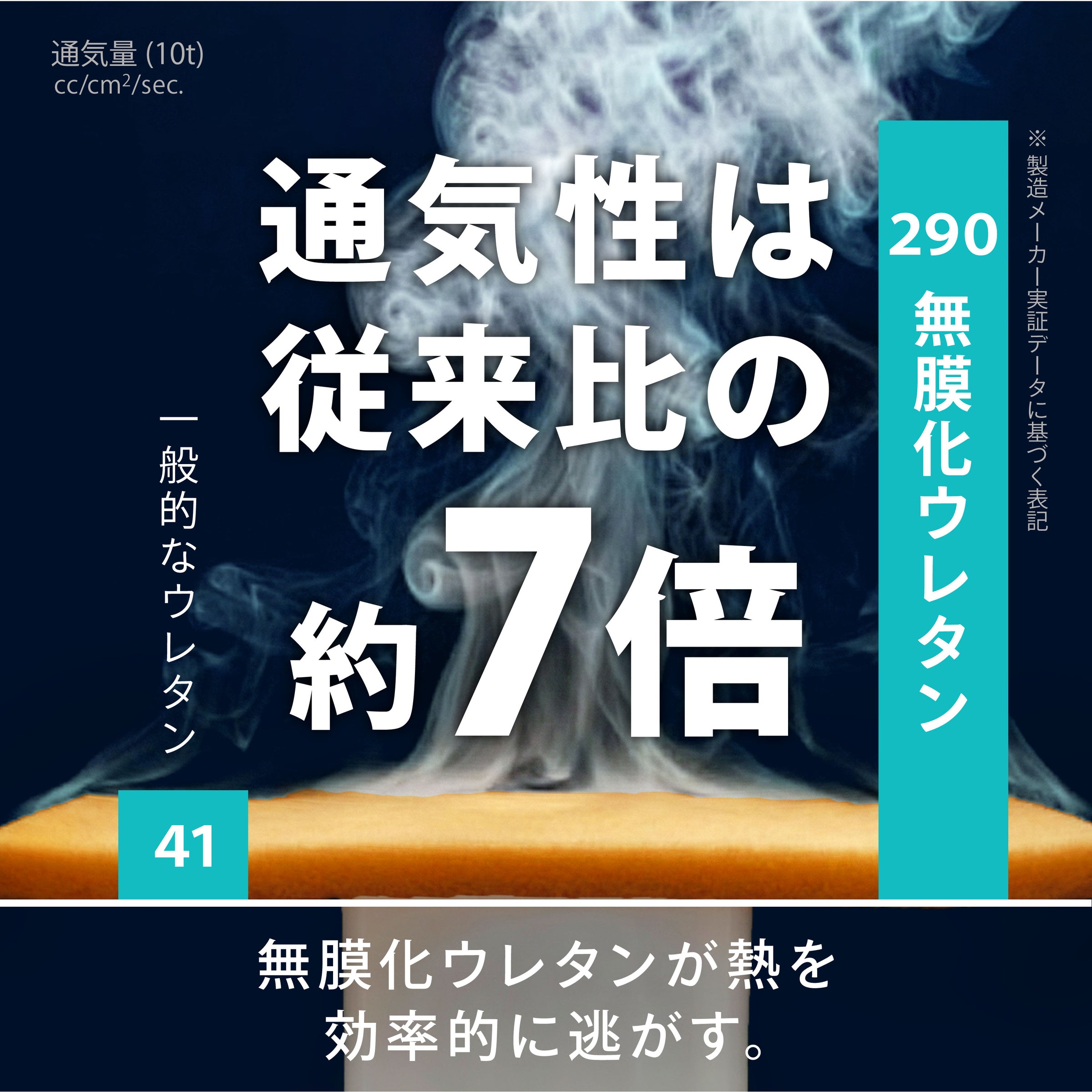 通常のウレタンフォームは膜があり通気性がほぼないため、熱がこもりやすい傾向にあります。